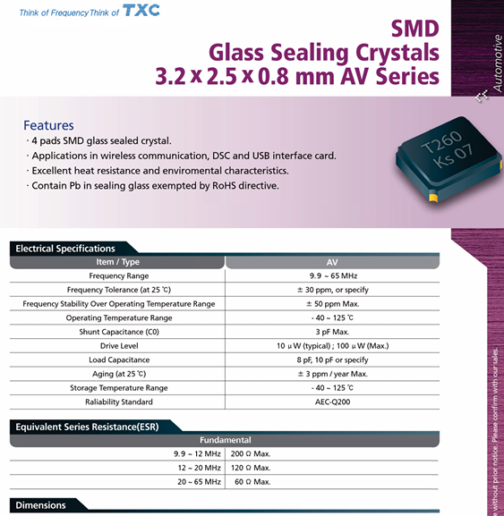 更多>>AV20000003黑色3225 20M 8PF車規(guī)TXC晶振